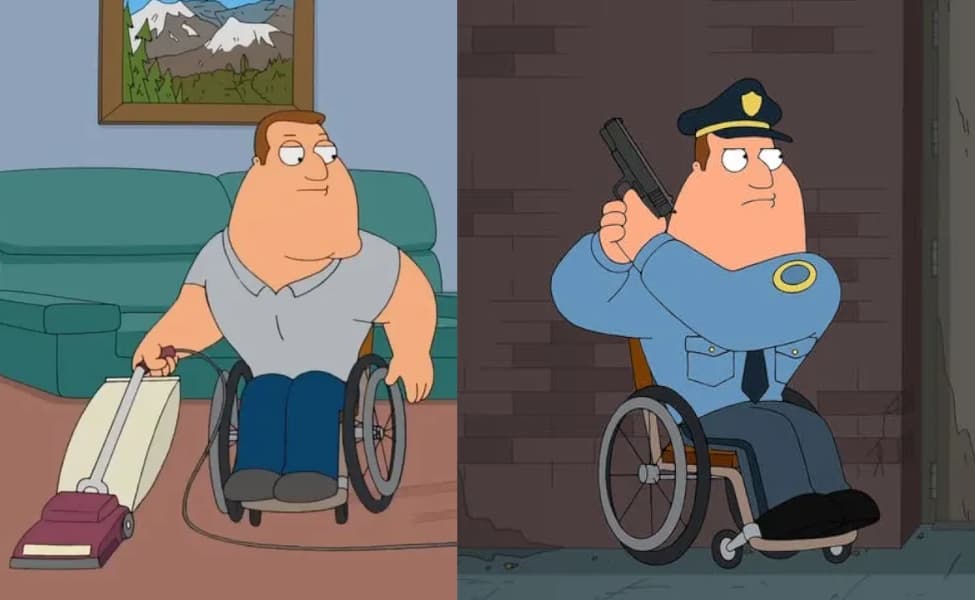 Introducing Joe Swanson, the resilient wheelchair-bound police officer from the animated sitcom Family Guy. Joe is a character who defies expectations and showcases the triumph of the human spirit. Despite facing the challenges of being paralyzed from the waist down, Joe's indomitable willpower and unwavering determination shine through in every aspect of his life. With his quick wit and sharp sense of humor, Joe proves that being a hero is not about physical abilities but about the strength of character.
